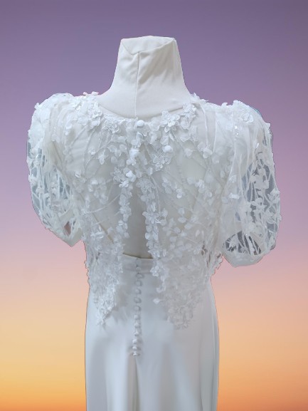 Parte superior: Apresenta um corpete com sobreposição em renda ou tule bordado com flores em relevo, conferindo textura e um toque romântico. As mangas curtas bufantes dão-lhe um ar delicado e atual.
