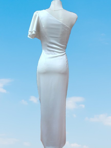 Decote: Assimétrico de um ombro só, com um detalhe de manga caída volumosa no ombro, conferindo um ar contemporâneo e elegante.