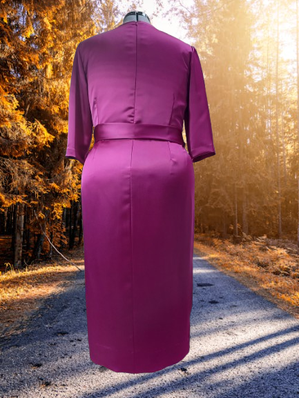 O vestido é de cor magenta (um tom entre o rosa e o roxo), feito num tecido acetinado que transmite elegância e sofisticação.