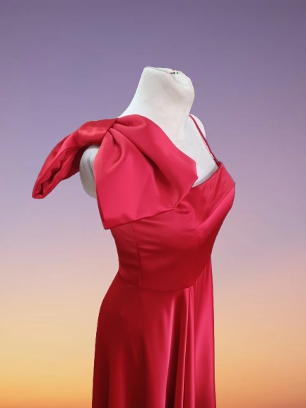 Vestido com decote reto, com uma alça fina de um lado e, do outro, um detalhe marcante: uma alça larga com aplicação em laço volumoso, que dá um toque sofisticado e assimétrico. O corte da parte superior é simples e ajustado, valorizando a silhueta. A saia é fluida e ampla, caindo suavemente até o chão, o que confere movimento e leveza ao vestido. O tecido acetinado, com um brilho suave, realçando a cor vibrante e dando um ar de requinte. É um vestido perfeito para eventos formais como casamentos, jantares de gala ou festas elegantes.
