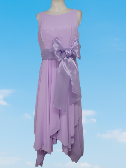 Vestido lilás com uma fita grande e elegante na cintura, de tecido suave com brilho, saia fluida com um design assimétrico, com um estilo leve e romântico, ideal para ocasiões