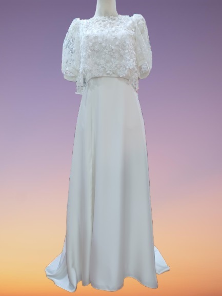 Vestido branco elegante que combina a delicadeza e fluidez. Textura sofisticada e romântica com visual clássico, ideal para graças especiais, como casamentos ou eventos formais, devido à sua combinação de
