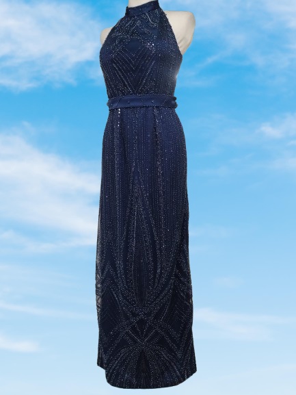 Vestido de um modelo elegante e sofisticado, de cor azul escuro, com detalhes que criam padrões geométricos delicados e intrincados em toda a sua extensão. O vestido ajustado bem ao