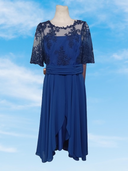 vestido é um modelo elegante em azul royal, com detalhes em renda na parte superior e mangas curtas transparentes também adornadas com renda floral. O corpo do vestido parece estruturado,