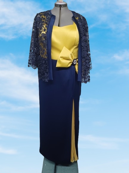 Este vestido é uma excelente escolha para eventos formais e elegantes. A combinação de azul marinho com amarelo cria um visual ousado e sofisticado. O amarelo vivo do corpete, em