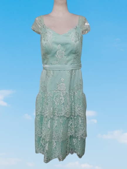 Este vestido é um lindo verde menta claro com sobreposição de renda e delicados padrões florais. A renda acrescenta um toque elegante e vintage, e apresenta um corpete ajustado com