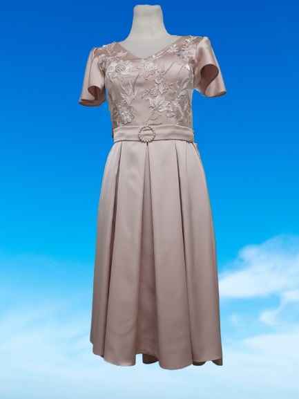 Vestido de cor pastel, com um design elegante e delicado. A parte superior do vestido com detalhes florais em relevância, combinados com mangas curtas. A cintura é marcada com um