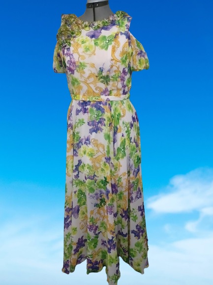 Vestido de padrão floral com uma mistura de cores, incluindo verde, lilás e amarelo, sobre um fundo claro. O design do vestido tem uma aparência leve e fluida, com mangas