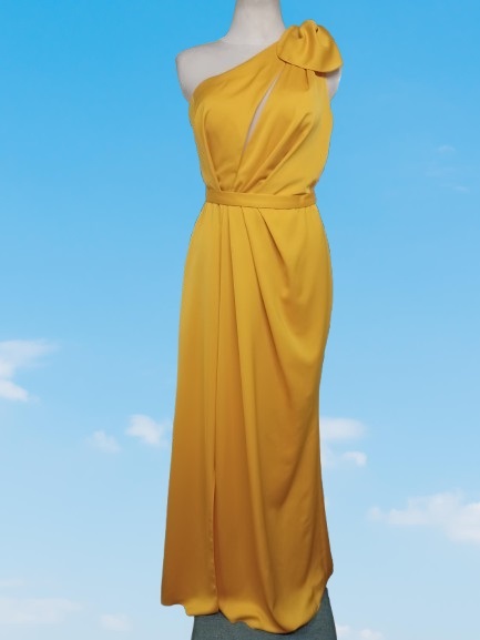 Vestido longo de cor amarela, de design assimétrico. Ele tem uma alça única que passa por cima do ombro, adornada com um detalhe de laço volumoso. De corte elegante, com