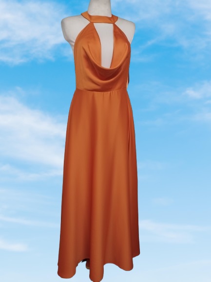 Vestido longo, de cor laranja, feito de um tecido acetinado com brilho suave. O vestido de alças finas e um decote profundo em forma de “V” com um detalhe drapeado,