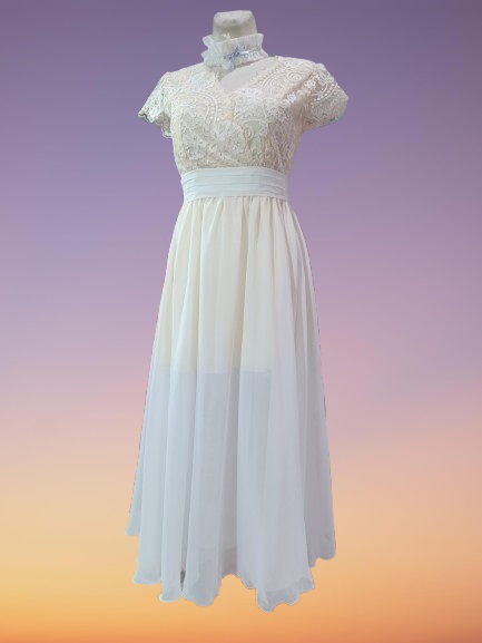 O vestido está absolutamente encantador! A delicadeza dos bordados combinada com o tom suave de azul dá-lhe um ar de elegância e sofisticação incomparáveis. A fluidez do tecido nas mangas